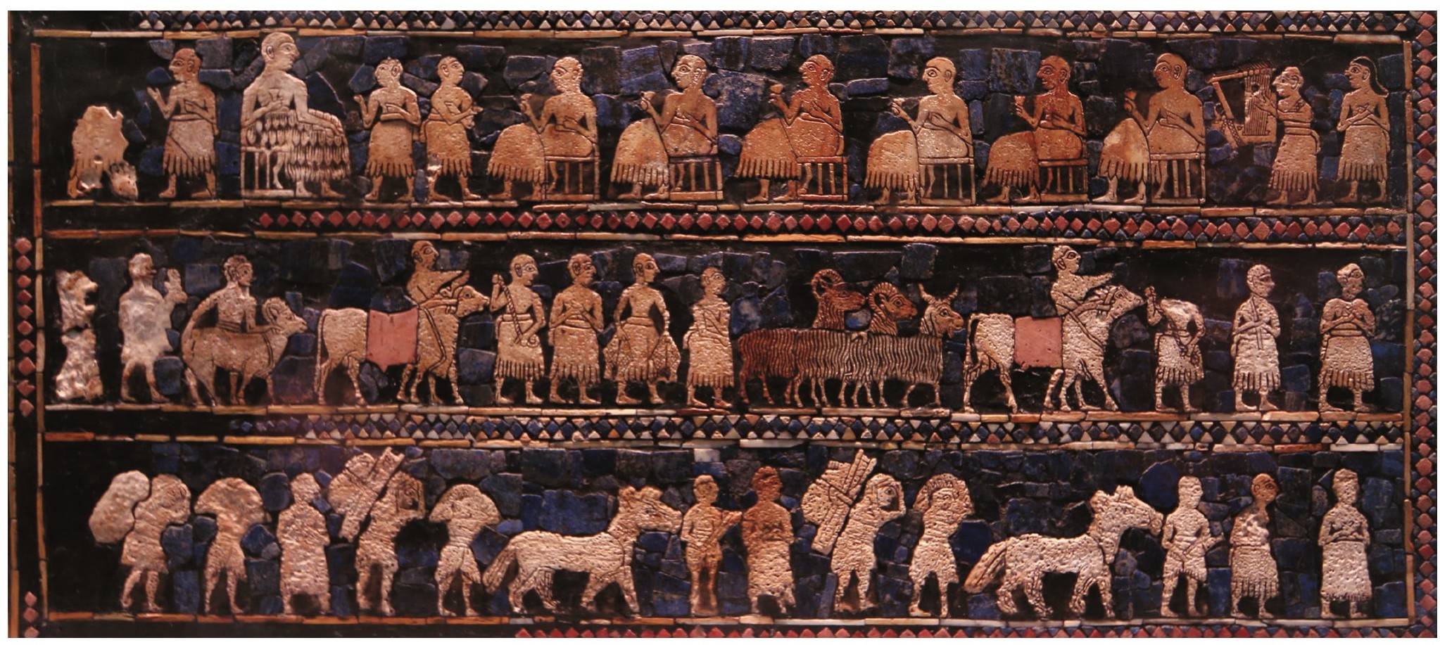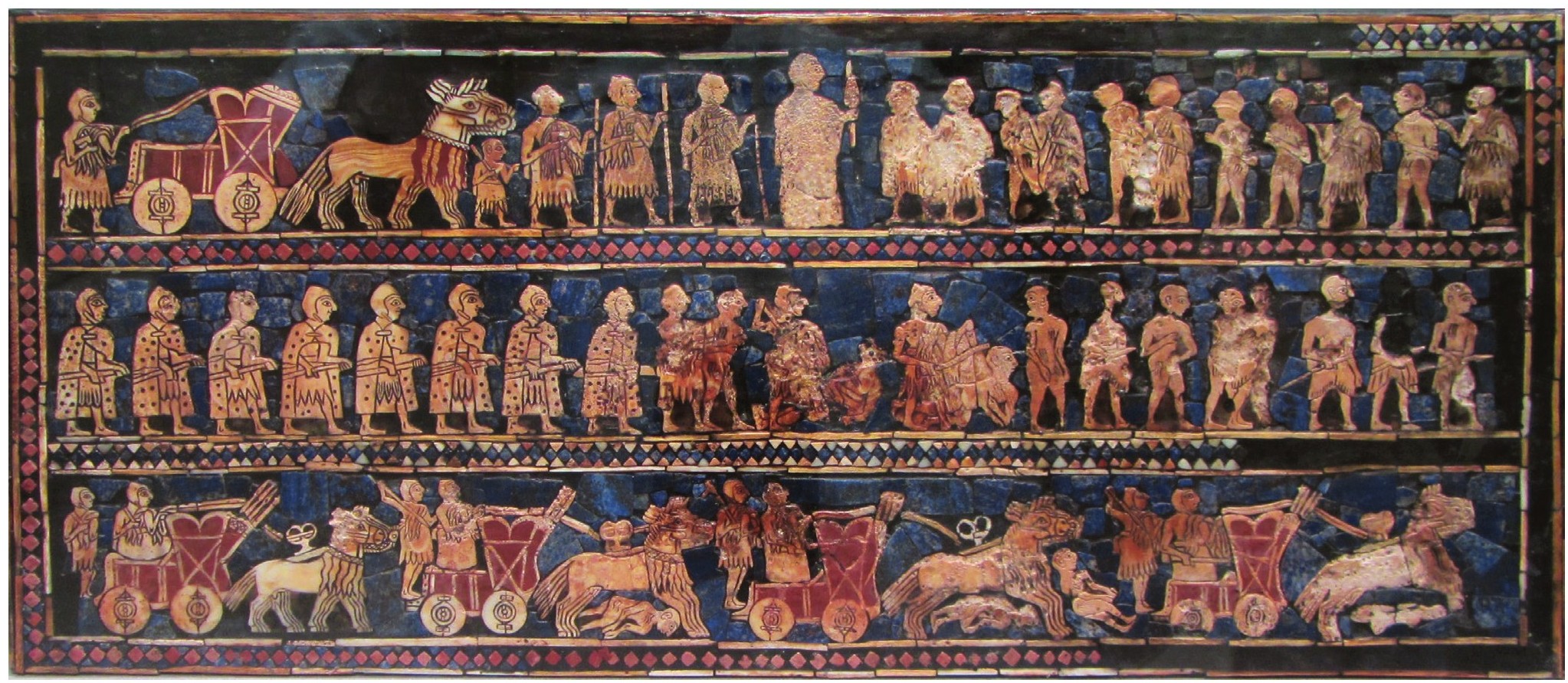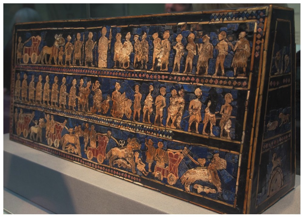 图1-18 《乌尔的军旗》,出土于伊拉克穆加耶土丘,木板装饰画,约公元前2600年,伦敦大英博物馆