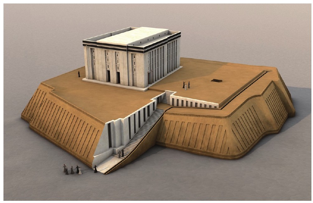神庙在苏美尔的城邦遗址中最为常见,通常建造在螺旋向上的高台上,这种由泥砖建成的塔形高台建筑被称为“吉库拉塔”(Ziggurat)。吉库拉塔顶上的神庙在苏美尔城邦中占据主导地位,它们是城中之城,既是神圣的宗教场所,也有行政管理功能,还是观察星象的天文台。