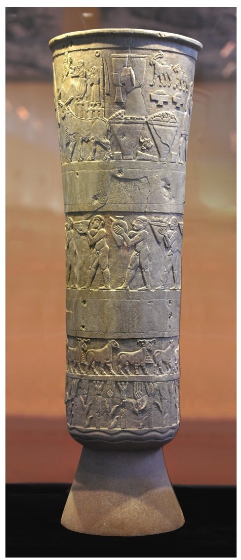 图1-16 瓦尔卡浮雕瓶,出土于伊拉克瓦尔卡,雪花石,约公元前3200—前3000年,伊拉克国家博物馆