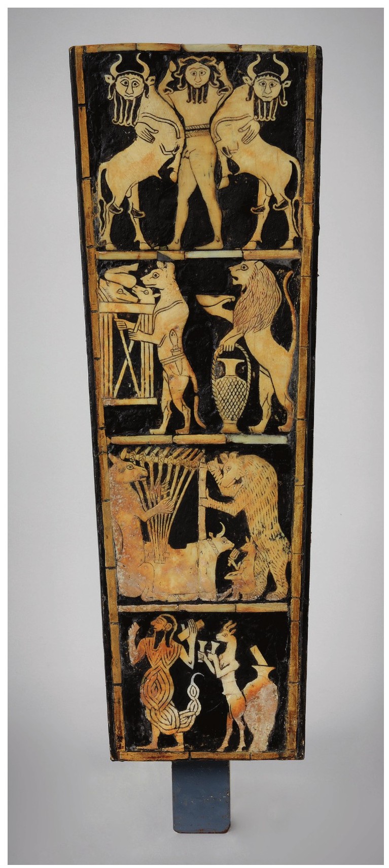 在《乌尔的军旗》的和平一侧,呈现了音乐家弹奏竖琴的场面。一架以牛头为装饰的木质竖琴(图1-21)出现在乌尔的另一座皇家墓地中。竖琴的音箱以牛头做装饰,覆盖着金箔,并镶嵌着天青石和贝壳。公牛的神态生动,牛眼炯炯有神,巨大的牛鼻似乎在翕动着。牛头下方展现了神话中的动物和人物(图1-22),最上层描绘的似乎是苏美尔史诗中英雄吉尔伽美什与两头公牛搏斗的场景,下面三层表现了冥界的景象。神话中的动物正演奏竖琴,纪念死者、赞美生命。