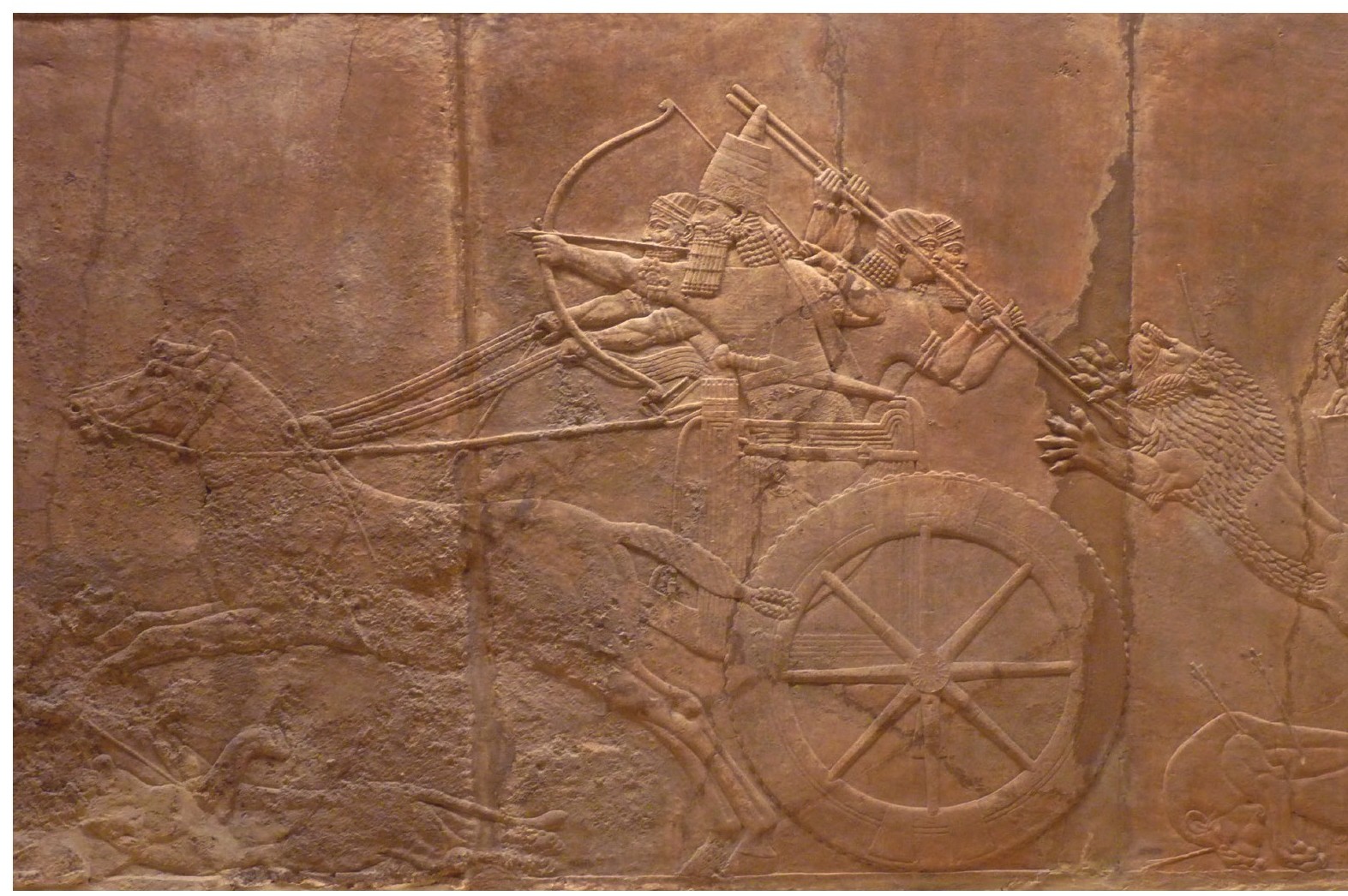 图1-27 《猎狮浮雕》,伊拉克尼尼微亚述巴尼帕北宫,石灰石,约公元前645—前640年,伦敦大英博物馆