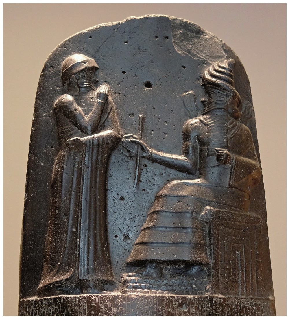 石碑顶部的高浮雕描绘了太阳神向汉谟拉比授予法典的场面。汉谟拉比站在太阳神沙玛什(Shamash)面前,右手环抱胸前,表示敬仰。太阳神端坐在宝座上,背后的火焰如同伸出的翅膀。汉谟拉比谦卑地站在太阳神面前,准备接过太阳神递来的绳圈和计量杆,这两件物品不仅象征王权,而且表示汉谟拉比有能力建构起严格的社会秩序,给予人民稳定的生活。雕塑家沿用了传统上正面与侧面结合的复合视角,但是刻画角度更加精确,甚至还创造性地尝试了局部的收缩透视效果,比如太阳神头顶上的螺旋形发饰。人物的眼部刻画也更加立体,生动地表现了汉谟拉比和沙玛什凝神对视的一刻。