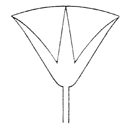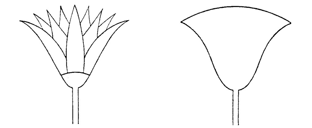 这种纯艺术的或者纯形式的角度贯穿于李格尔的纹饰研究之中,比如李格尔对埃及莲花纹饰发展的研究和解释。莲花是贯穿埃及古王国到新王国的最主要的纹饰,包括平面的和建筑的立体装饰。它的基本形状是钟形,对于这种钟形,李格尔之前的考古学家,比如古德耶尔认为最初来自两种纹饰——侧面莲花纹和伞形莎草纹(图4—2)。伞形莎草多见于尼罗河下游的芦苇沼泽地带,而莲花遍布干旱的上埃及,这两种花草都是埃及的宗教象征。古德耶尔等人认为,伞形纹饰是莲花和莎草的合并体,既可以被看作莲花原型,也可以被视为莎草的原型。李格尔不同意古德耶尔等人的说法,认为伞形纹饰只来自莲花原型。李格尔把图4—2中右侧的伞形纹饰看作左侧的侧面莲花纹饰的抽象概括。这种抽象手法还可以在另一种侧面莲花纹饰中看到(图4—3),后者可以看作上面两种纹饰的综合。这证明了埃及人遵守的形式原理,即他们总是愿意在一个确定的轮廓中缩减细部。