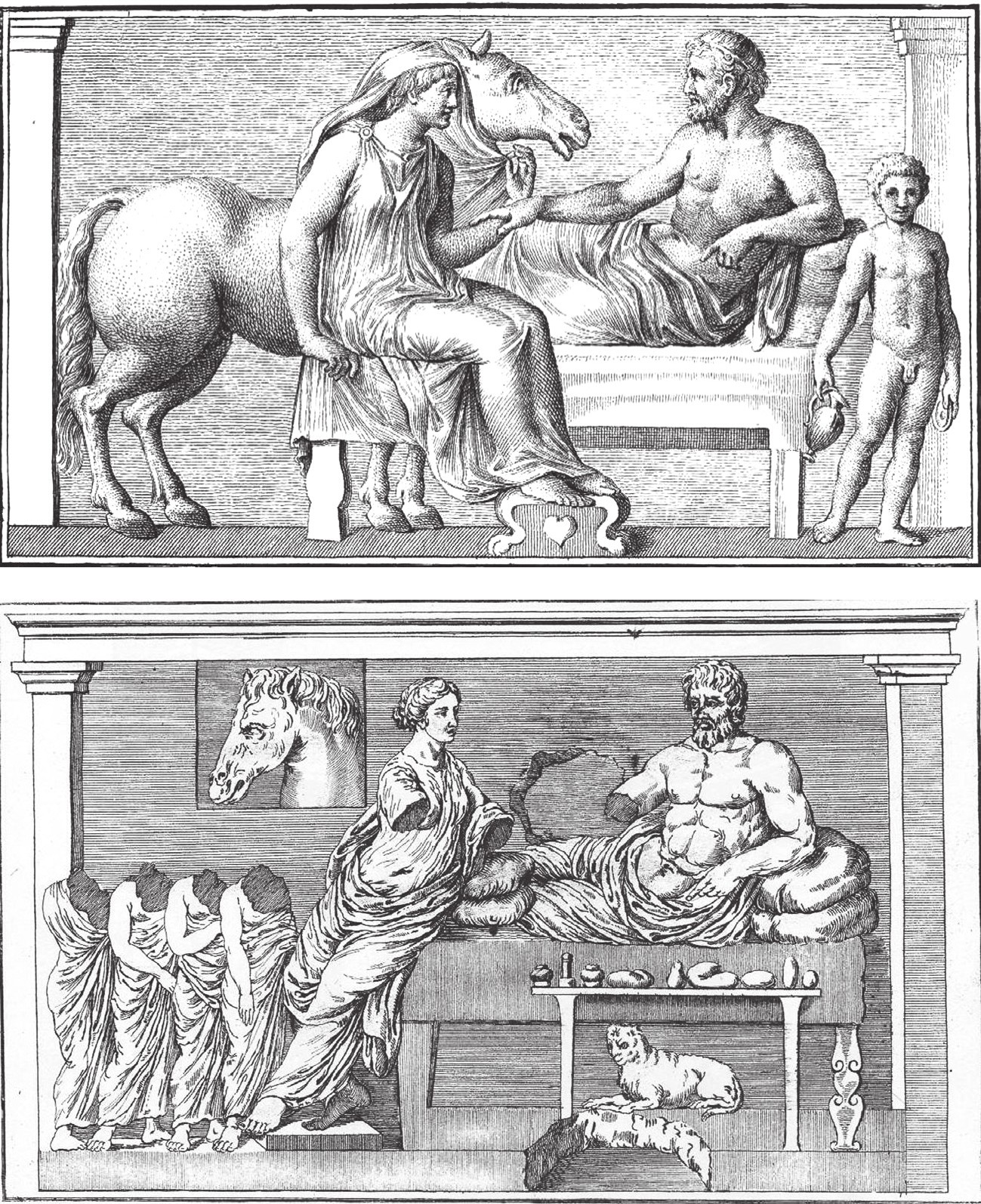 《克瑞斯、海神和亚里安》(图1—9)是温克尔曼在罗马发现的两处石棺浅浮雕。在这两件作品中,海神波塞冬(Poseidon)凝视着美丽的农神克瑞斯(Ceres)。古希腊神话中,海神波塞冬对他的妹妹克瑞斯垂涎已久,有一次趁克瑞斯变身为牝马之时,波塞冬变为牡马使克瑞斯受孕,之后克瑞斯产下一匹小马,取名为亚里安(Arion)。温克尔曼认为这两件浮雕中的马和马头就是亚里安。而对第一幅图中的小男孩,温克尔曼猜测他可能是婚礼守护神,也可能是海神波塞冬或他的侄子(传说中波塞冬的同性爱人)佩洛普斯(Pelops)的守护神。而第二件浮雕中的四个女神可能是照料亚里安的爱琴海女神们(Nereids)。正是根据温克尔曼的这些描述,这两件浮雕作品才有了今天的名字。这些珍贵的文献对古代文化考古和研究帮助极大。 特别是对意大利的古迹发掘,比如对赫库兰尼姆(Herculaneum)和庞贝(Pompeii)的发掘产生很大影响,这两个古代遗址的成功发掘是温克尔曼的文化研究的最好范例。很多有钱的收藏者来到意大利,他们不仅去看那些展示在私人收藏室或者刚刚建立的公共博物馆(比如卡彼托利尼博物馆[Capitoline Museum])里的古代大师的作品,而且还搜集自己的收藏品。当时并不富裕的意大利和罗马成为古代文化爱好者朝拜的圣地。此外,温克尔曼的研究也对他那个时代的艺术趣味产生了影响。