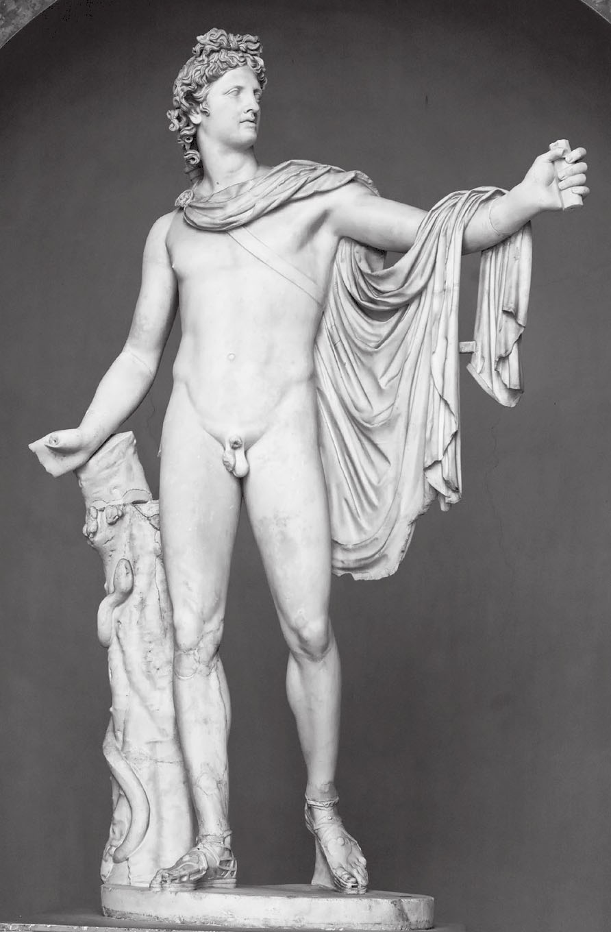 图1—12 《望景楼的阿波罗》,大理石,罗马复制品,高224厘米,130—140年(可能最初由希腊雕塑家莱奥哈雷斯完成于公元前330—前320年),梵蒂冈博物馆。