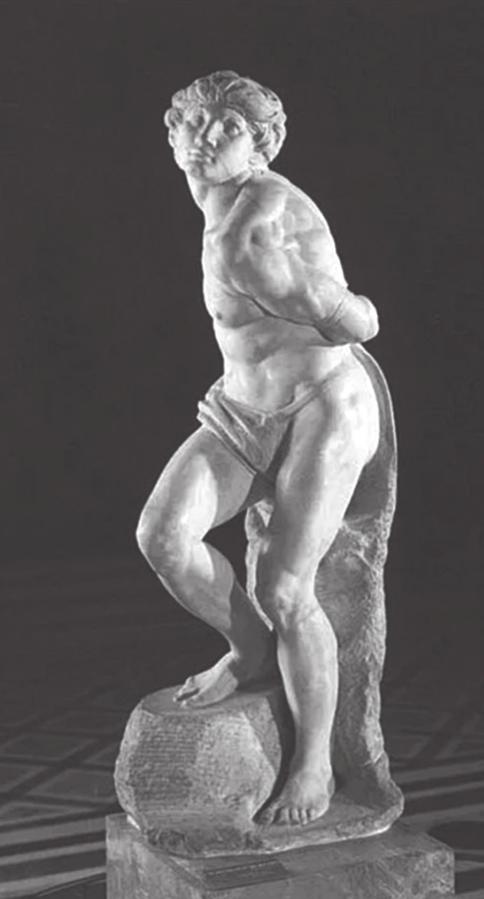 图1—8 米开朗基罗,《被缚的奴隶》,大理石,高215厘米,1516年,法国巴黎卢浮宫。