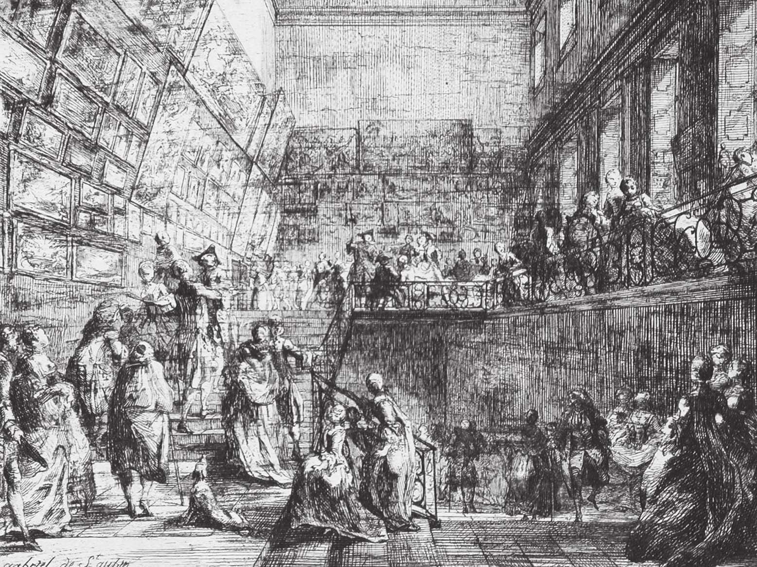 托马斯·E.克劳(Thomas E. Crow,1948— )在其著作《画家和公众生活:18世纪的巴黎》中,描述了18世纪的沙龙在当时所起的作用。沙龙是最早的公共展览形式,是市民参与艺术的重要形式。特别是女性市民从家庭中走出来,进入公共场所,通过读书、讨论等活动以及剧场、咖啡馆、公园等场所,重新塑造自己的公众形象。沙龙展(图2—2、2—3)首次于1737年出现在巴黎,由巴黎绘画雕塑学院主办。从此,沙龙展开始代替以往的年展而成为主导巴黎公众生活的重要艺术事件。尽管在此之前,也有一些艺术的公众事件发生,这种传统甚至可以回溯到古希腊时期,比如神庙和雕塑落成的庆典等。但是,那种公众空间仍属于官方、精英阶层和教会。18世纪之前的公众雕塑和绘画的本质是礼仪性的,是政治和宗教社群文化的组成部分。而18世纪的沙龙展,首先是一种持续的展示活动,是不受宗教和专制权力约束的当代艺术的自由展览,旨在推动公众对艺术进行美学的理解和评判。
