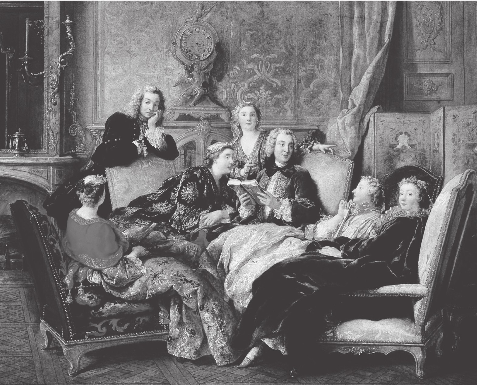 《阅读莫里哀的作品》(图2—1)是法国画家弗朗索瓦·特罗伊(François Troy,1679—1752)绘制的读书场面。这是一个家庭空间,一些中产阶级人士聚在一起读书。画面中心捧书的男子似乎刚结束朗读,在这休息的间隙,目光从书上移开,望向画面右边斜倚着的女子。这位女子却正注视着画外,若有所思。与此同时,朗读者身旁的另一位女子正把头凑到男子的书前,似乎怀着崇拜的心情,焦急等待着书中描写的即将发生的故事。后排那位倚在沙发靠背上的男子一手托腮,正惬意地凝视着他对面坐着的女子。我们虽然看不到这个女子是否也以同样的目光回应,但整幅画充满了洛可可式的暧昧情调。画中的服装、家具和钟表等,也都是华托时代的洛可可风格。值得注意的是,在这样一个轻松舒适的中产阶级家庭空间里,他们阅读的却是莫里哀的现实主义作品—是《伪君子》还是《悭吝人》?是《可笑的女才子》还是《无病呻吟》?从这幅作品中,我们可以看到,莫里哀这些嘲讽权贵和教会的作品,成为启蒙时代中产阶级茶余饭后闲聊甚至调情时的谈资。