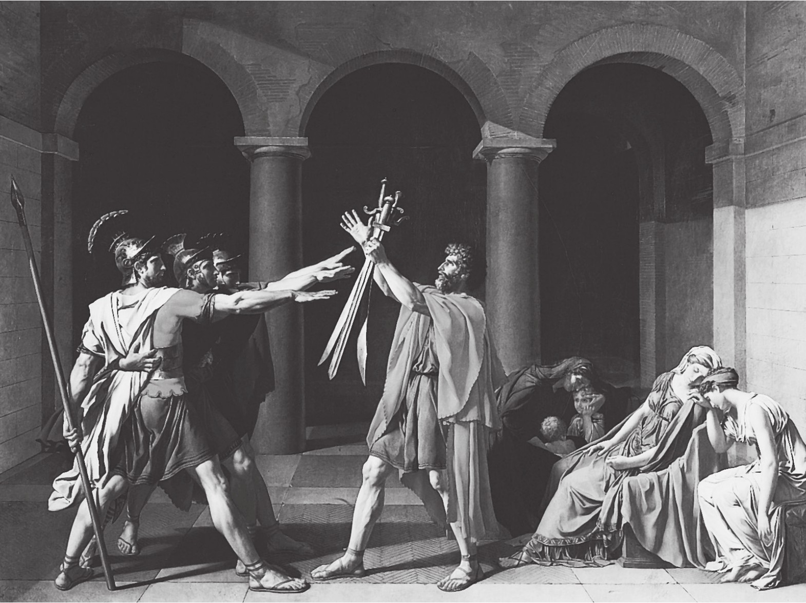图2—4 大卫,《荷拉斯兄弟的誓言》,布面油画,330厘米×425厘米,1784年,法国巴黎卢浮宫。