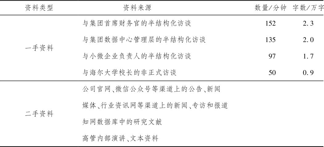 依据Eisenhardt and Graebner(2007)的抽样原则,本文选取海尔集团的共赢增值表作为研究对象,原因有三:第一,典型性和代表性。海尔集团是传统制造业企业向生态平台企业转型的杰出典范,对传统企业的战略转型和管理变革具有借鉴意义。第二,新奇性和先进性。为适应物联网生态系统的发展,海尔提出了共赢增值表这一新型价值管理工具,并不断实践和优化,取得了显著的成效,既有理论上的创新也有管理实践上的参考价值。第三,资料可得性高。海尔集团的管理经验一直以来备受社会和学术界的关注,二手素材丰富、资料翔实;本文作者赴海尔进行实地调研,获得了充足的一手调研资料,有助于更深入理解这一研究问题。