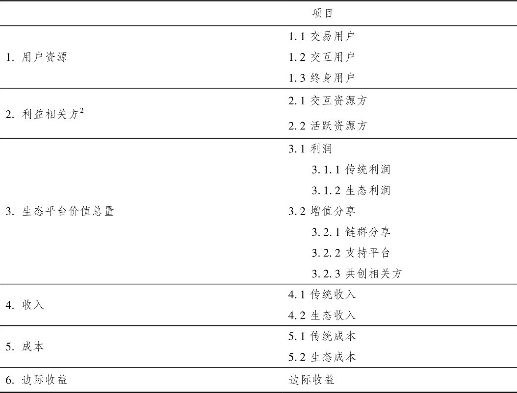 收入包括原有业务的传统收入和平台经营的生态收入,单用户收入是指平均到每个用户对收入的贡献。将收入计量范围扩展到整个生态系统创造的收入总和,克服了传统利润表只关注本企业自身收入而忽视合作伙伴收入的情况,有利于促进平台合作各方的互利共赢。