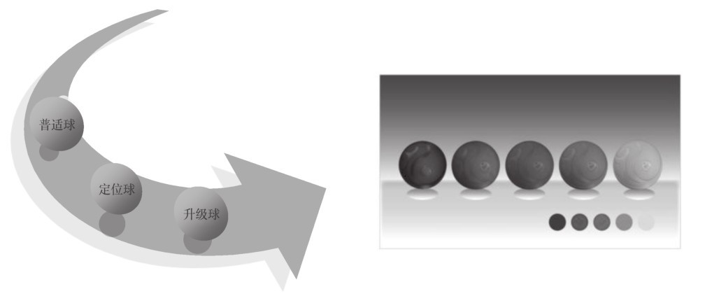 无极球可分为普适球、定位球、升级球三种。所有人都要从普适球开始习练,习练一段时间后,根据实际情况再选择一种重量及大小适合的无极球来作为自己的定位球,以此为基础进行不断的升级习练。无极球的分级如图1-1所示。