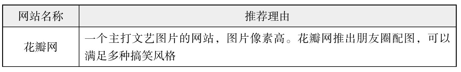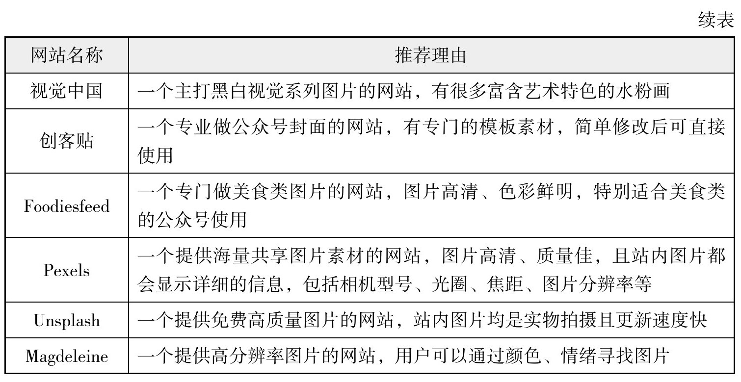 相比动图网站,静图网站更多,部分静图网站如表2-2所示。国外部分图片网站更新速度快,质量高,很值得推荐。在选用图片时,要注意版权。运营者可多了解一些图片网站,闲暇时间再进行分类整理,使用起来会更加得心应手。