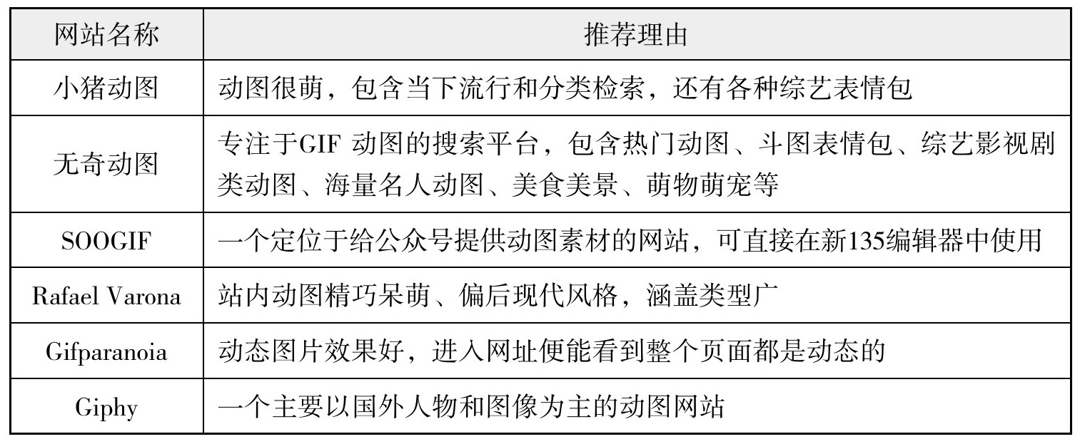 在做公众号运营时,有些心情用文字根本表达不出效果,这种情况下就可以适当选用表情。这里推荐一些不错的动图网站(排名不分先后),如表2-1所示。