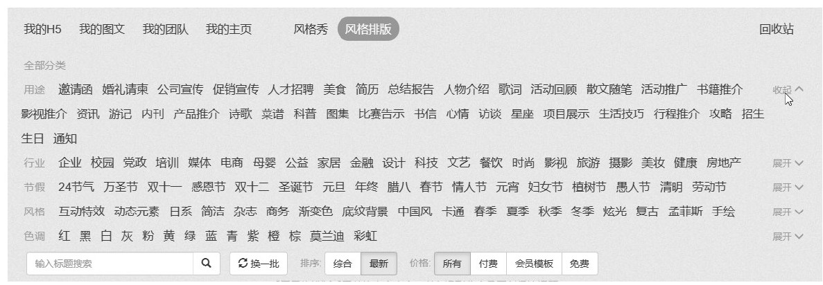 秀米编辑器是一款功能强大、容易上手的微信公众号编辑软件。这款工具适合排版初学者,利用它可以轻松完成图文排版。如图2-7所示,新媒体运营者可根据不同的用途、行业等元素找到适合自己的排版风格,并一键套用。