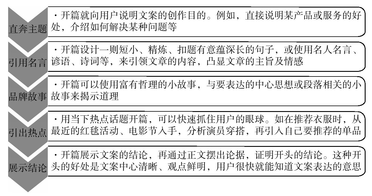 新媒体文案的开篇也是营销的重要环节,好的开篇起着承上启下的作用,能将由标题吸引来的用户引入正文中。通常新媒体文案的开篇布局有图3-8所示的几种方式。