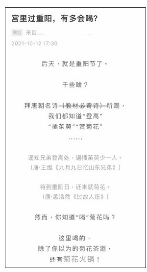 例如,某公众号文案开篇就引出了“重阳节”这一热点,并且引用了名人名诗,吸引读者继续阅读正文,如图3-9所示。