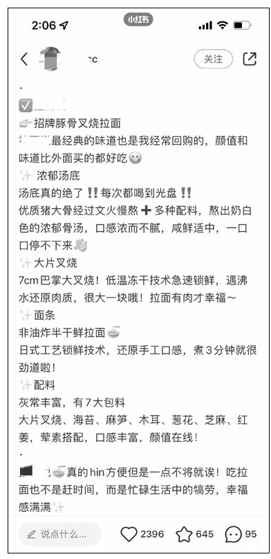 想激发读者对产品的兴趣,可以直接展示产品特点或产品能带给用户的好处。例如,某速食品牌的某款拉面的文案,简单明了地说明了这款拉面的汤底、配料、面条等卖点,如图3-10所示。这种正文创作方式在新媒体文案中最为常见,其结构就是“特点1+特点2+特点3……”,不同的段落写不同的特点,这种并列式的正文结构能把产品的特点比较清晰、准确地表达出来。