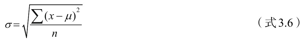例如,小明的零花钱每月有20元,小强的零花钱每月有30元,小强的零花钱每月比小明多10元;如果都进行平方处理,小明的零花钱是400元,小强的零花钱是900元,小强的零花钱比小明多了500元,这完全扭曲了两人真实的零花钱差距。你肯定会问,那我们怎么办呢?很简单,再开方,让平方变成一个“过场”,作用就是消除负号,于是得到了总体标准差,见式3.6。
