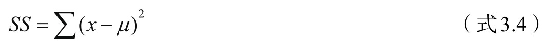 继续改进公式。如果让原始数据的离均差取平方后再求和,就可以消除正负抵消的影响。于是就有了离均差平方和(sum of squares of deviation from mean,SS),见式3.4。