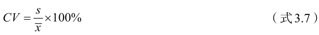 因此,当度量衡单位不一致,进行数据离散趋势比较时,我们用各自的离散趋势标准差除以各自的均数,这样不仅可以消除度量衡单位不一致的影响,还可以得到相对于其自身而言,离散趋势所占的比例,从而实现可比,这就是变异系数,见式3.7。