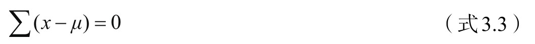 鉴于上述情况,人们设计了离均差和,见式3.3。我们发现离均差和永远等于0,我们计算指标是用于比较的,但是任何一组数据的离均差和均为0,则无法比较。为什么为0呢?因为会出现正负抵消的情况。例如,数据“1、2、3”,它们的离均差分别为-1、0和+1,所以离均差和就等于0了。