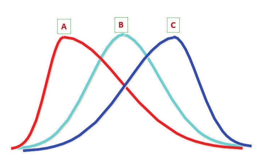 上面三种分布类型分别为正偏态分布(A)、对称分布(B)和负偏态分布(C)。在对称分布中,当对称性和峰度较好时,它就是我们熟知的“正态分布”。以对称分布为例,其形态酷似一个沙堆,沙堆越往中间沙子越多,到中间顶部时沙子最多。这种越靠近中间频数越多的趋势就是统计学中描述的集中趋势(central tendency)。如果我们让一捧沙从沙堆中间慢慢流淌而下,会发生什么现象呢?除了沙堆顶部会轻微增高一点(因为集中趋势),绝大部分的沙子会顺着沙堆四周滑落。我们并没有让沙子滑落,而沙子自然而然地四散而去,这也是一种趋势,叫离散趋势(dispersion tendency)。