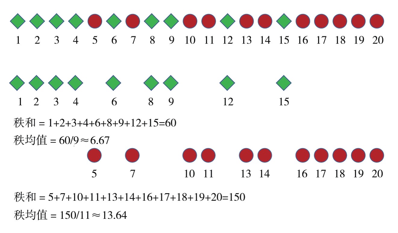 例如,研究20名同学的身高,我们对20名同学按照从矮到高排序,菱形代表女生,圆形代表男生。排完顺序后,按照1~20进行编号,这个编号就是秩次,如图3.3所示。