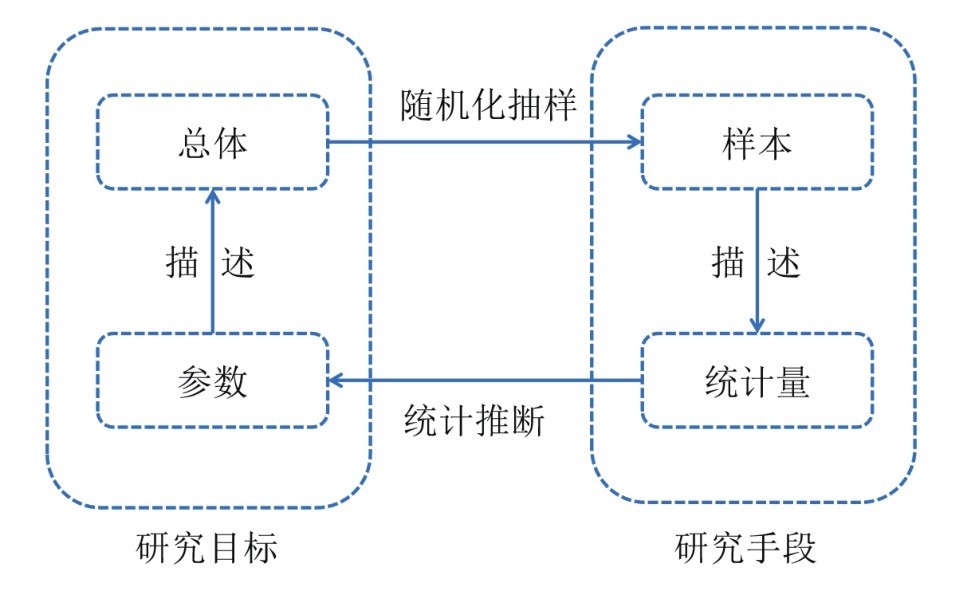 “生活不止眼前的苟且,更有诗和远方的田野”。同样地,统计不只是样本,更有总体和参数。如前面章节所言,统计学研究的目标往往是无限总体,但总体往往不可得,只能从总体中按照既定的抽样方法获取样本,通过描述这些样本,获得样本的统计量。然而,统计量并不能告诉我们要研究的总体参数,我们只能通过样本的统计量去推断总体参数,这个过程就是统计推断,如图4.1所示。统计推断包括参数估计与假设检验两种方法。