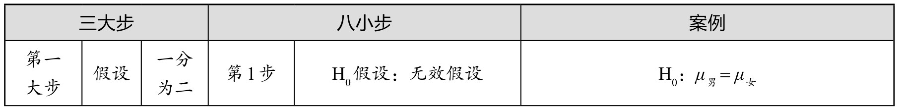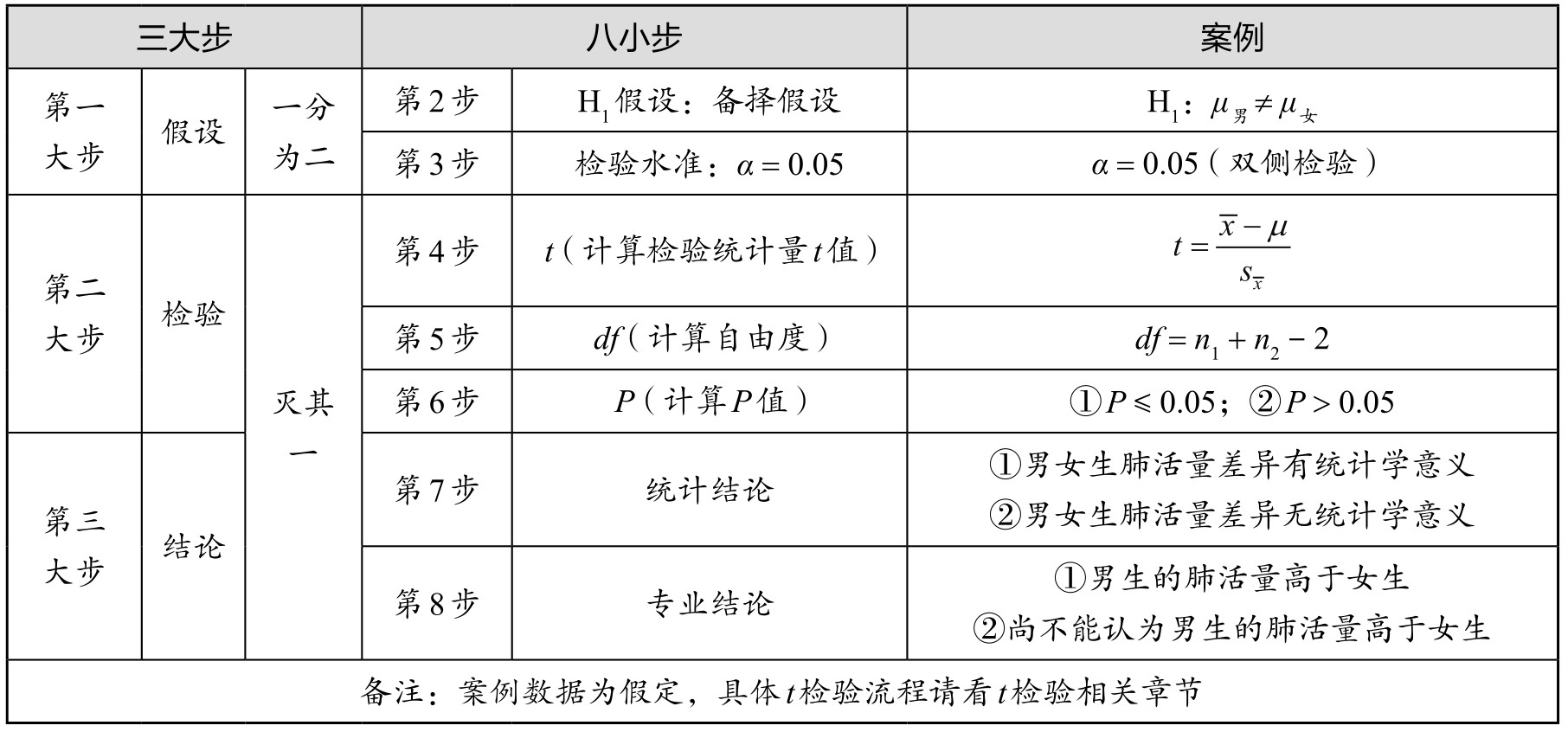 虽然假设检验思想为“一分为二,灭其一”,但在实际科研中,一般分为三大步和八小步。例如,以检验不同性别大学生的肺活量差别为例,采用t检验展示具体步骤,如表4.1所示。