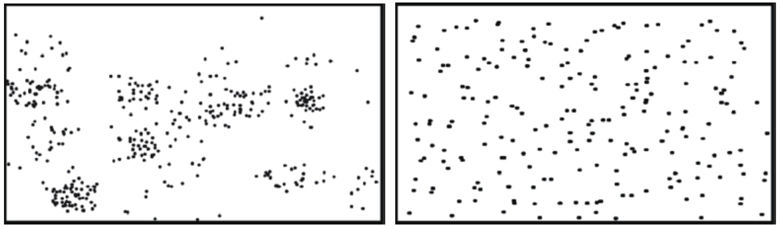 因此抽样误差的特点是不可以避免,但可以减少。我们可以通过增大样本量减少抽样误差。可以看图1.2来帮助理解,图中右侧目标事件的分布相对较均匀,而左侧目标事件则呈现明显的聚集性。