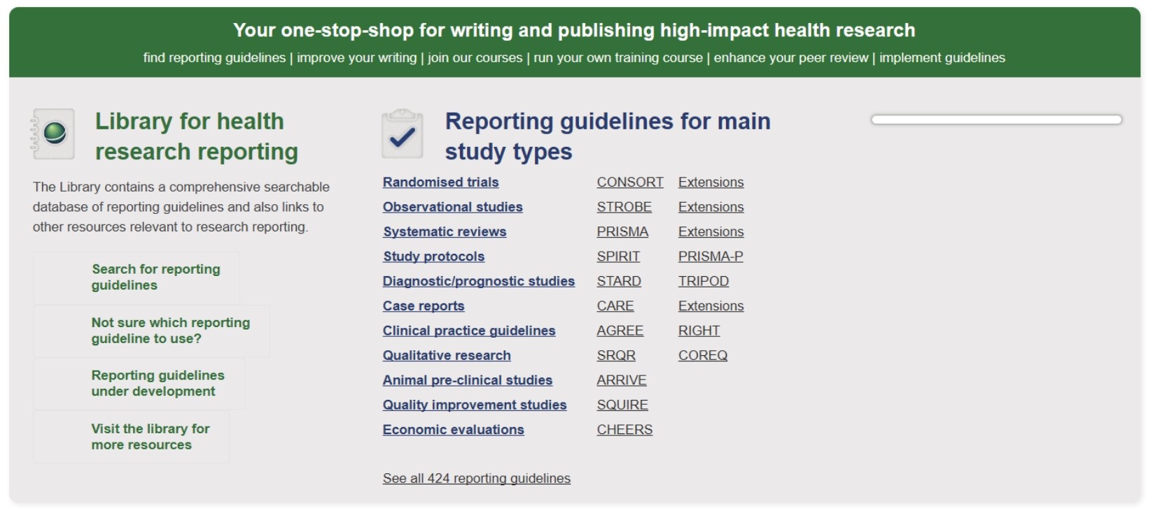 统计表达是对统计分析结果的展示,而医学统计报告是对整个试验统计结果的汇报。国际上和国内对科研结果的表达与报告都有相应的规范。医学论文主要报告规范包括随机试验CONSORT及其扩展、观察性研究(STROBE)及其扩展、系统综述与meta分析及其扩展(PRISMA)、诊断试验(STARD)、临床预测(TRIPOD)、病理报告及其扩展(CARE)、研究方案(SPIRIT)、临床实践指南、定性研究、临床前动物研究、经济学研究等。这些规范均免费发布,大家可以从网络上获取并学习,如EQUATOR网站提供了医学方面各种研究的声明(见图1.5)。