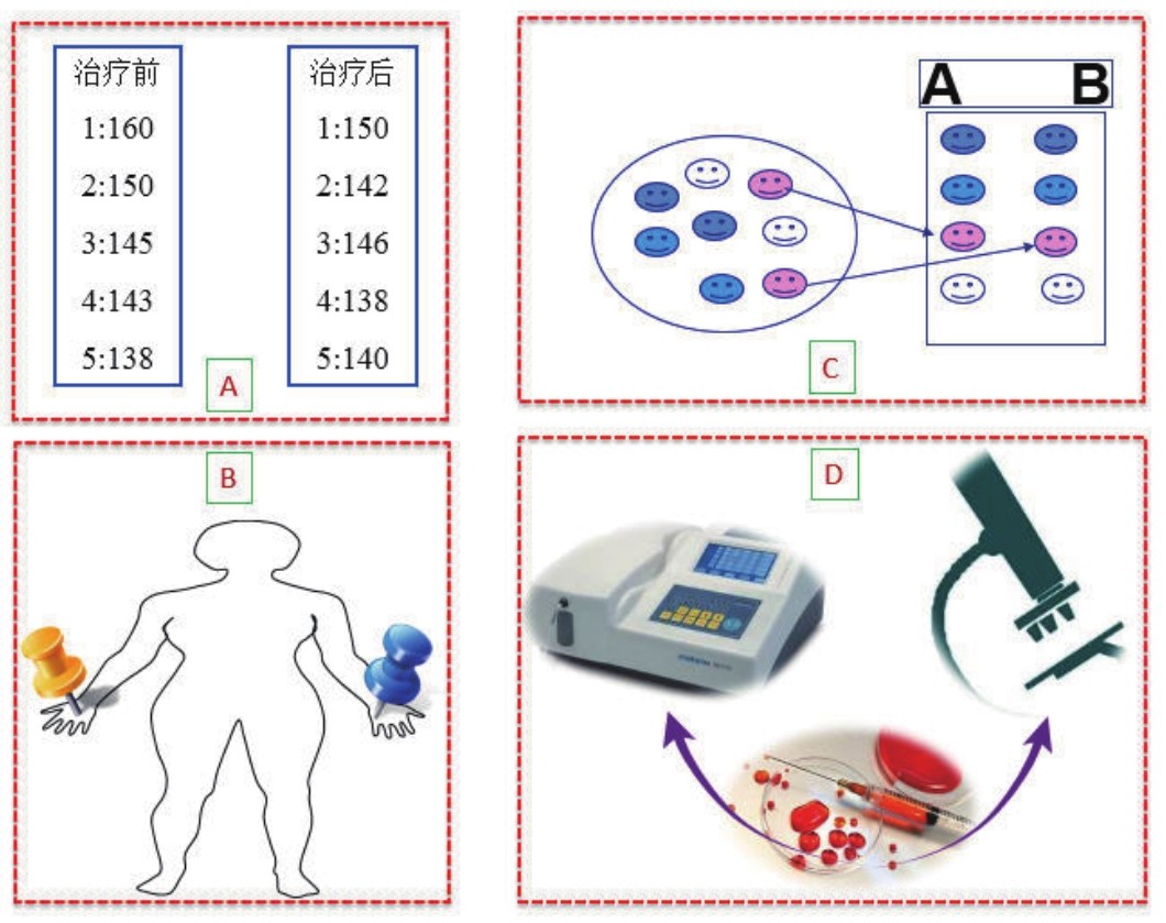 配对设计(paired group design)四种类型模式如图2.5所示,包括同一组受试对象干预前后配对(A);同一个受试对象身体不同部位配对(B);条件相同的2个受试对象配对,然后随机分到2组中(C);同一份标本分别接受不同的处理(D)。配对设计相对于前面的成组设计,统计分析效率更高,因为组间可比性较好,研究的样本量也相对较小。配对设计实施难度比成组设计复杂,一般只在特定的情况下才使用。