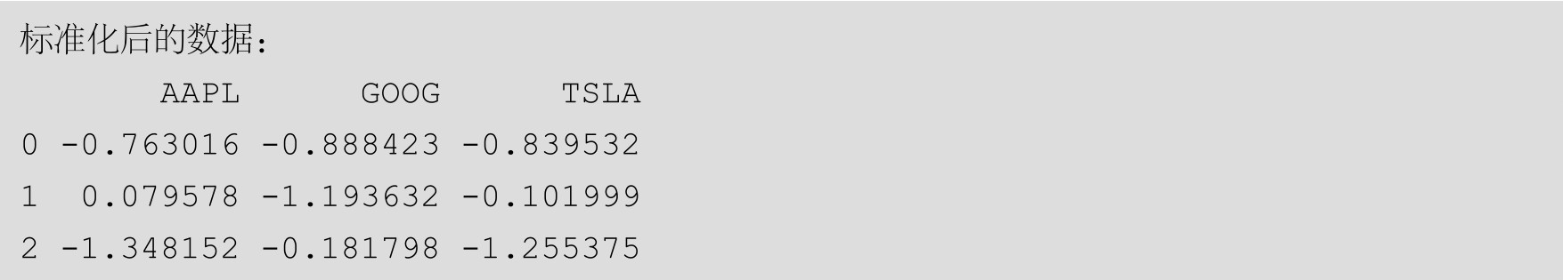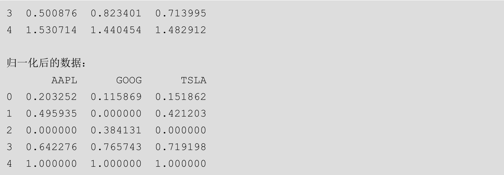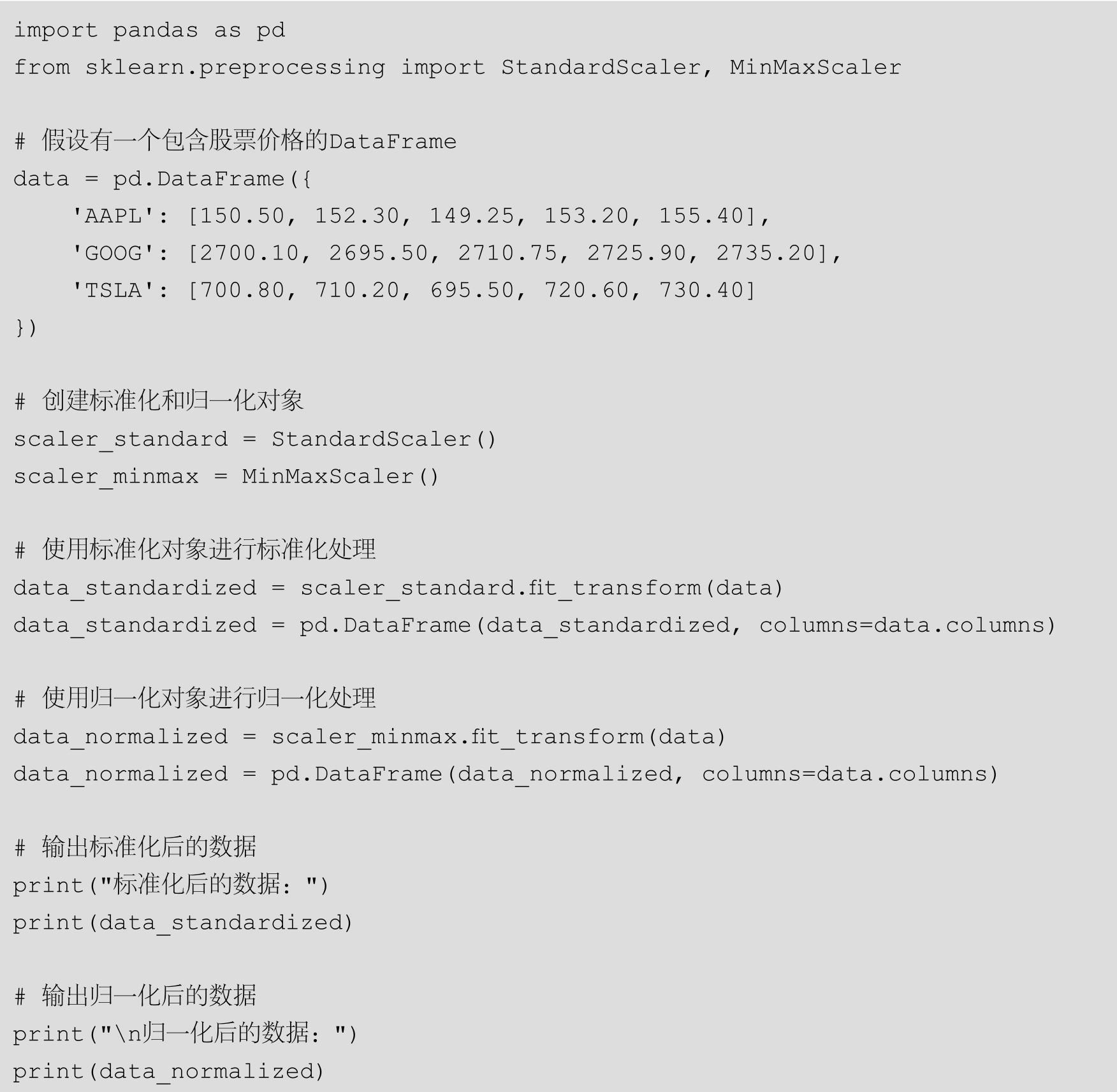 在上述代码中,首先创建了一个包含了若干股票价格的DataFrame,然后使用StandardScaler进行标准化处理,以及使用MinMaxScaler进行归一化处理。最后,输出处理后的数据。执行后会输出如下代码。
