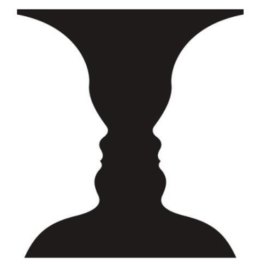 其基本特征是整体由部分组成,但它不等于部分之和,而是独立于部分的全新整体;整体不因部分的大小、方位、材质的变化而变化。比如由虚线组成的圆形,不论虚线的基本图形是正方形、长方形、圆形或其他形状都能让人感觉所组成的图形是一个圆形。如图2-28所示,墙上只有鱼头和鱼尾的雕塑,但给人一种墙把鱼身遮挡了一部分的感觉。再如图2-29所示,大部分人最先看到三角形,但实际上三角形根本不存在,只是我们脑补出来的轮廓。利用这个原理设计的Logo都很耐看,比如图2-5所示的中国体育彩票Logo。另外就是图与底(背景)互相转化,面积小的容易成为图,面积大的容易成为底,图2-30所示的图形是杯子,而看背景则是两个人的侧面轮廓。这个也叫作正负形,著名艺术家埃舍尔、设计师福田繁雄就创作了很多经典的正负形作品。在Logo设计中,利用正负形设计是一种常用的方法,如太极图。