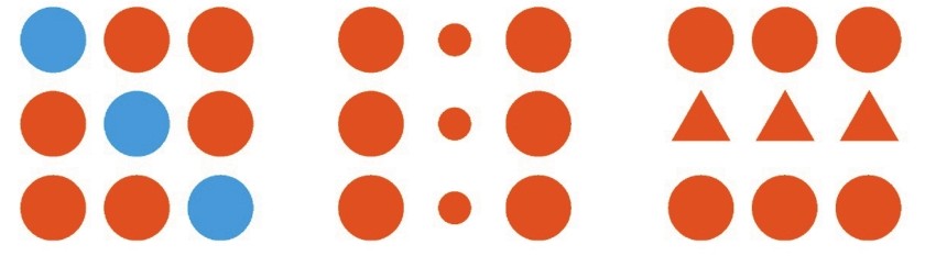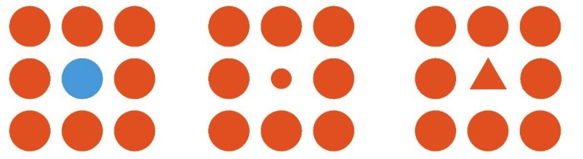 需要注意的是,在设计中,要强调某一部分则需将相似律反其道而用之,即平面构成中所谓的“突变”,也有人称之为“孤立效应”。以图2-36为例,在众多相同的图形中有一个颜色、大小、形状发生了变化,我们总是最先记住那个发生变化的。前面提到的独特性,其实就是广义上的孤立效应。