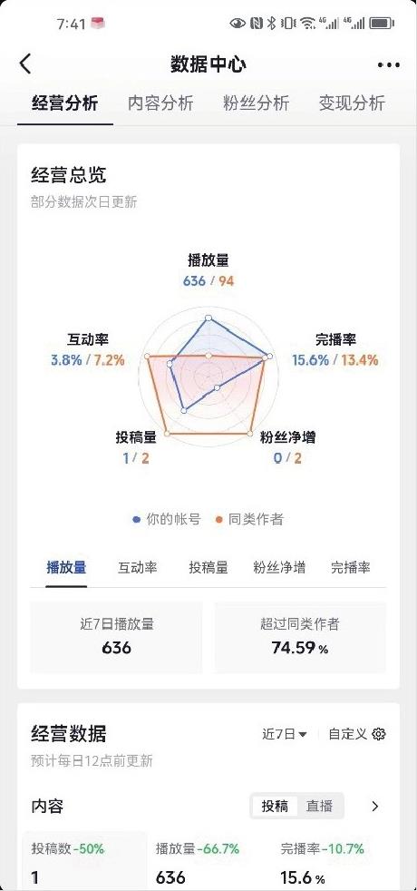 在【详情】找到【数据中心】,查看经营分析(见图1-31)。在对比图中,你可以很直观地通过5个维度(播放量、互动率、投稿量、粉丝净增、完播率)了解你与同类作者的差距。