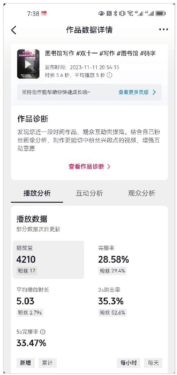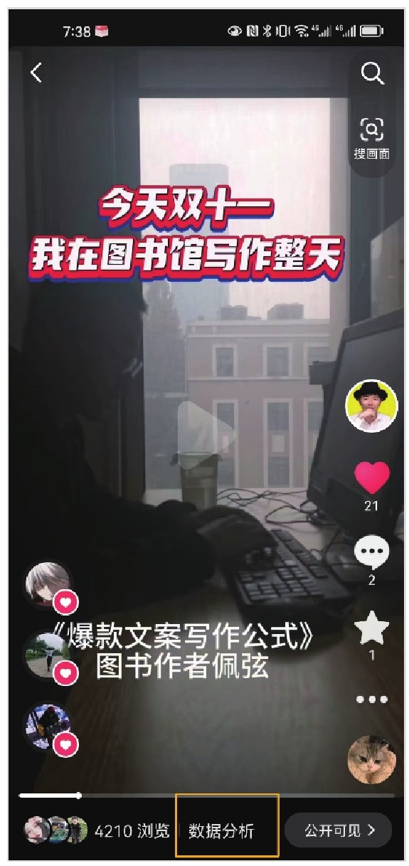 查看单个作品的数据,直接找到作品后点击【数据分析】即可(如图1-28、图1-29所示)。