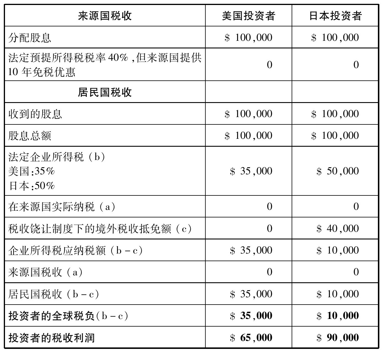 表2-1 Laurey对美国投资者和日本投资者的税收负担比较