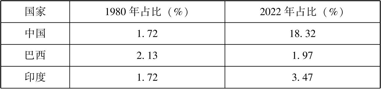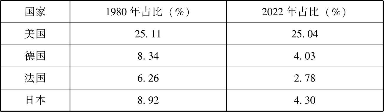 从表1.7可见,从1980年和2022年主要国家GDP占全球经济总量比重的变化来看,中国、印度等新兴经济体GDP占全球经济总量比重整体上升。尤其是中国,上升幅度最大,其间中国GDP占全球经济比重由1.72%上升至18.32%,上升了16.60个百分点。而美国、德国、法国、日本等发达国家GDP占全球经济总量的比重都出现不同程度的下降。但是,中国经济在快速增长的同时,也存在经济结构不合理的问题,特别是服务业发展滞后。