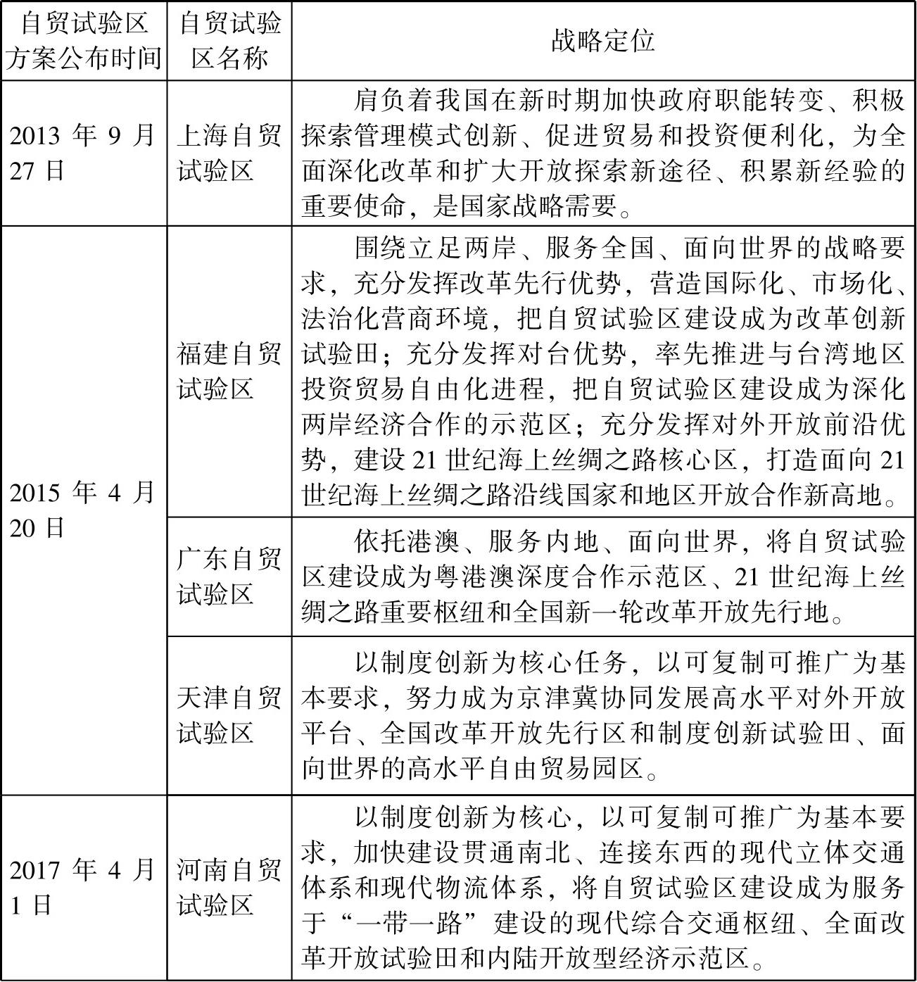 由于国务院颁布的关于自贸区的大多数文件使用“自贸试验区”的称谓,本书基本上也用该称谓,但若有出现“自由贸易区”“自贸区”等称谓时,含义与“自贸试验区”一样,本书中的这三个称谓实际上均指“自由贸易园区”。