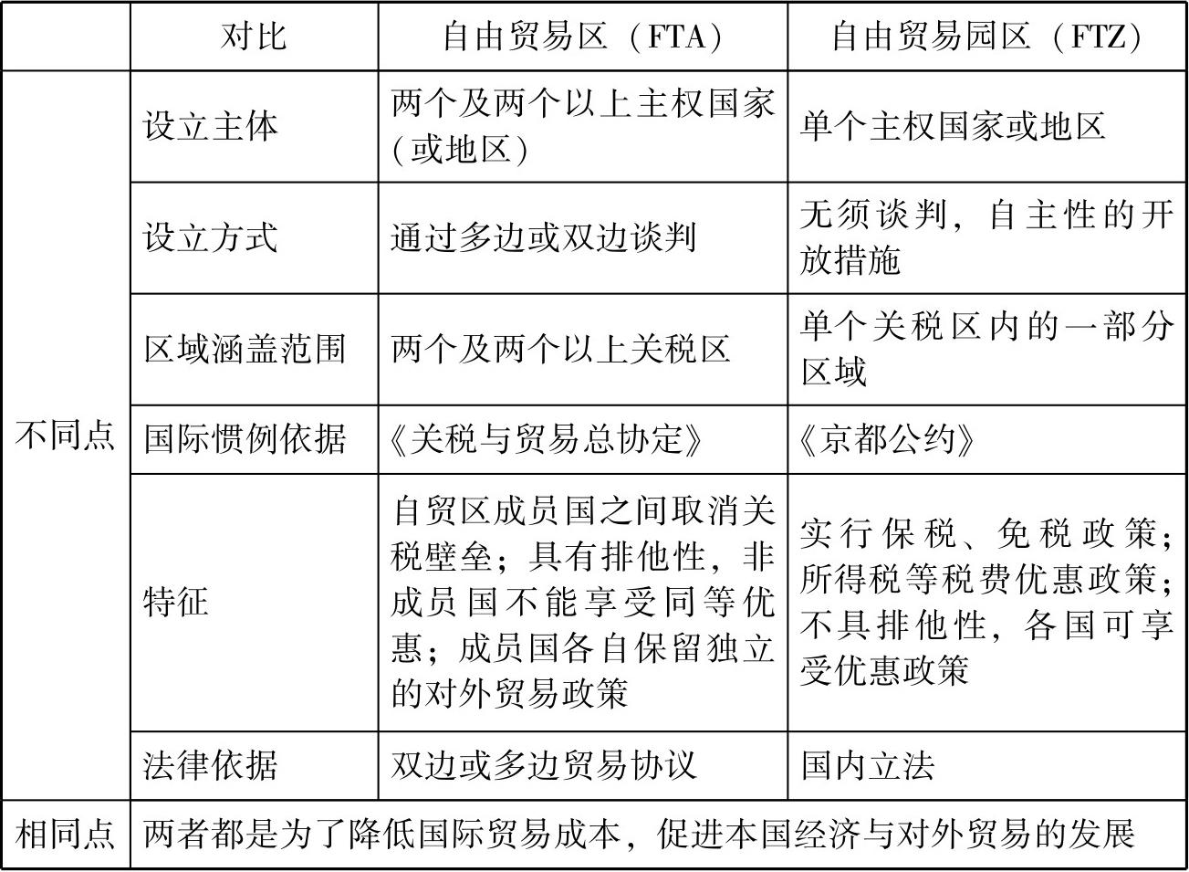 通过前文对FTA和FTZ的对比分析可发现,两者既存在共同点,也在设立主体、设立方式、法律依据等方面存在诸多差异。