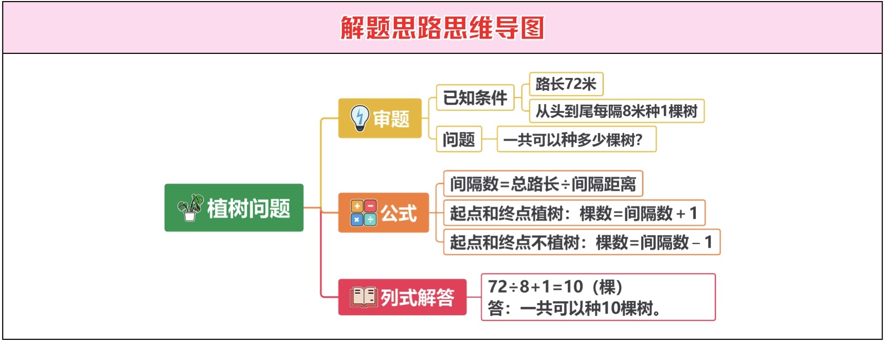 每隔8米种1棵树,72里面有9个8,这个9其实就是把72米平均分成9个间隔,因为从头到尾都要种树,所以树的棵数比间隔数多1,即9+1=10棵。
