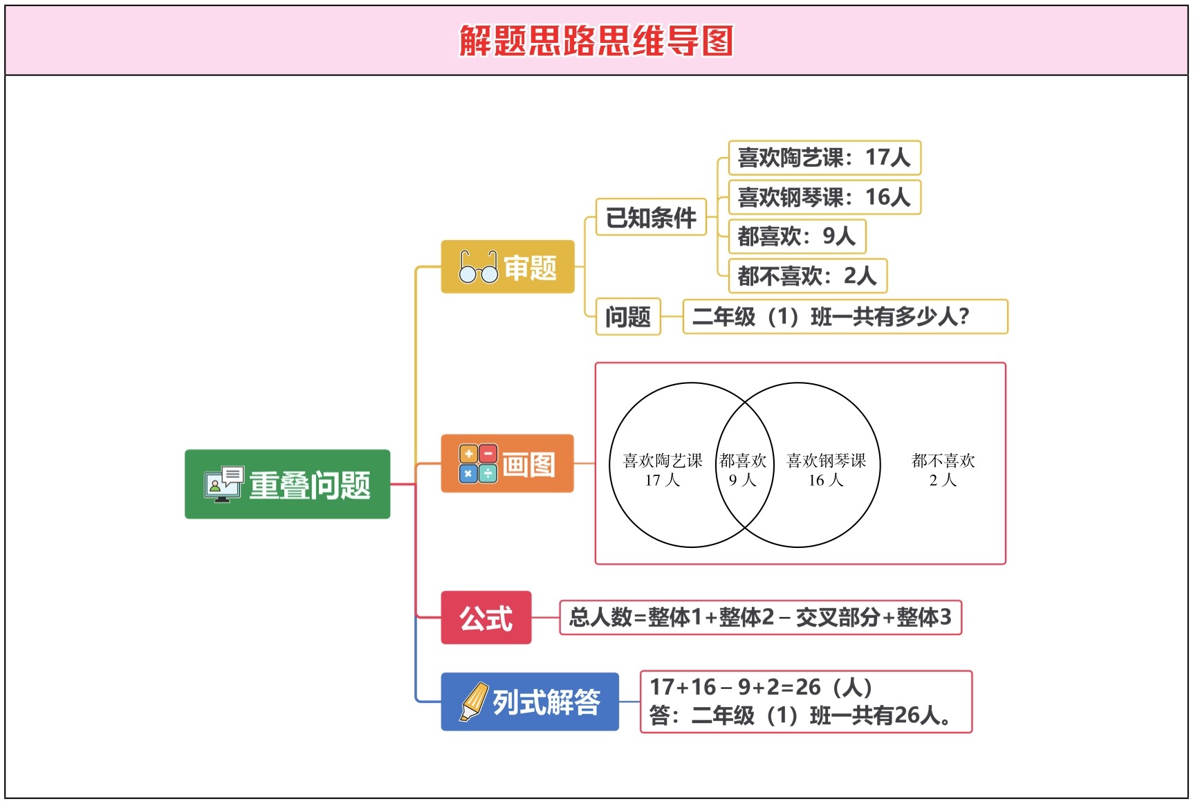 例 : 天立学校有丰富多彩的选修课,二年级(1)班喜欢陶艺课的有17人,喜欢钢琴课的有16人,两门选修课都喜欢的有9人,两门选修课都不喜欢的有2人,二年级(1)班一共有多少人?