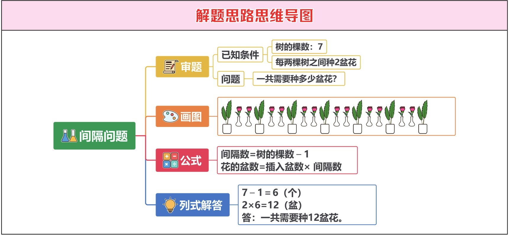例: 有7棵树排成一行,如果在每两棵树之间种2盆花,想一想,一共需要种多少盆花?