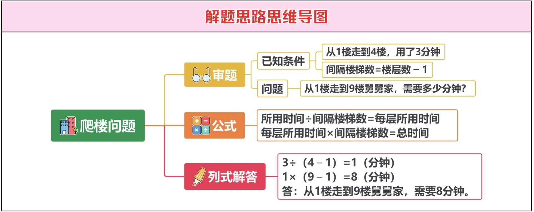 例 : 娇娇家住在4楼,她从1楼走到4楼,用了3分钟,如果娇娇用相同的速度,从1楼走到9楼舅舅家,需要多少分钟?