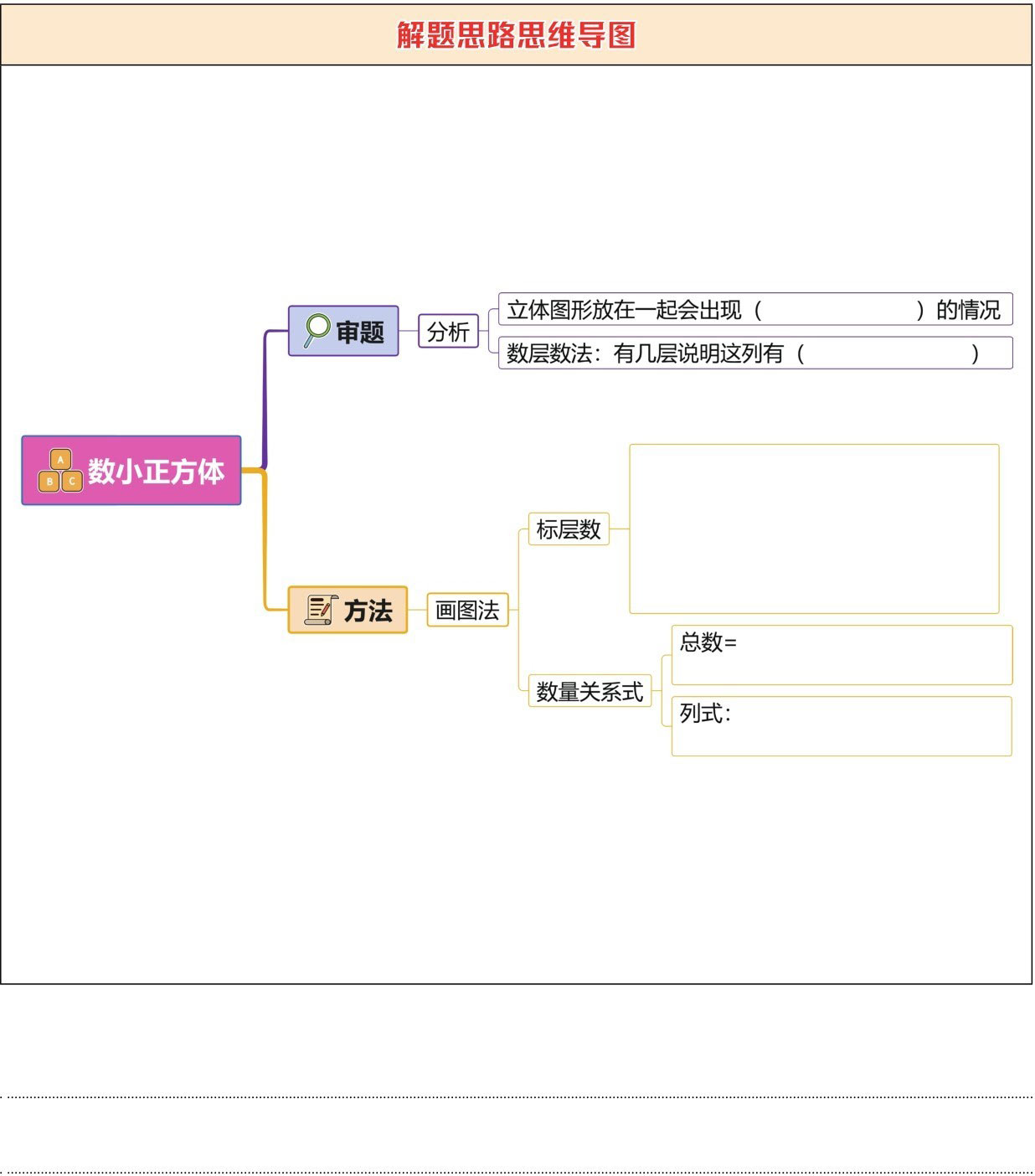数小正方体这类图形题考查的是空间想象能力,利用形象思维,巧用“数层数法”,不仅速度快,还能避免重复和遗漏。