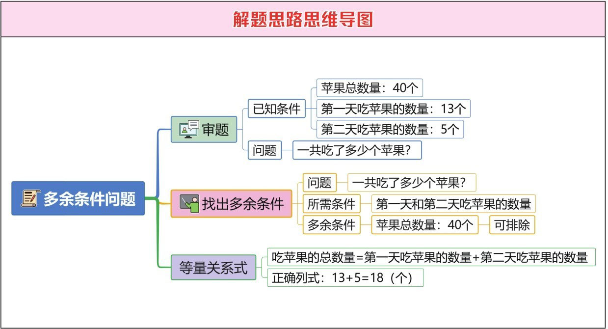 例: 妈妈买回来40个苹果,第一天吃了13个,第二天吃了5个,一共吃了多少个苹果?