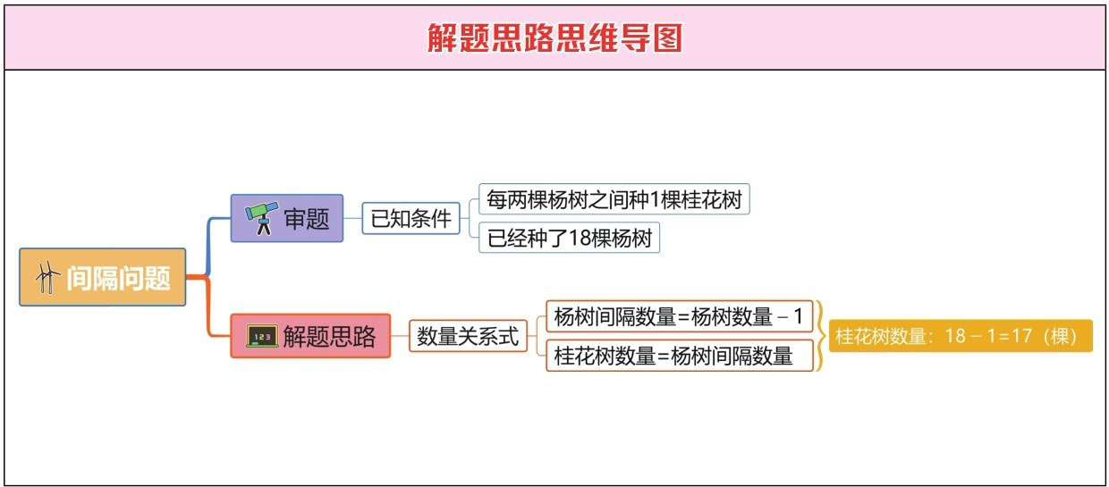 例: 李叔叔要在公路的一侧种杨树和桂花树,已经种了18棵杨树,还要在每两棵杨树之间种1棵桂花树。李叔叔需要种多少棵桂花树?