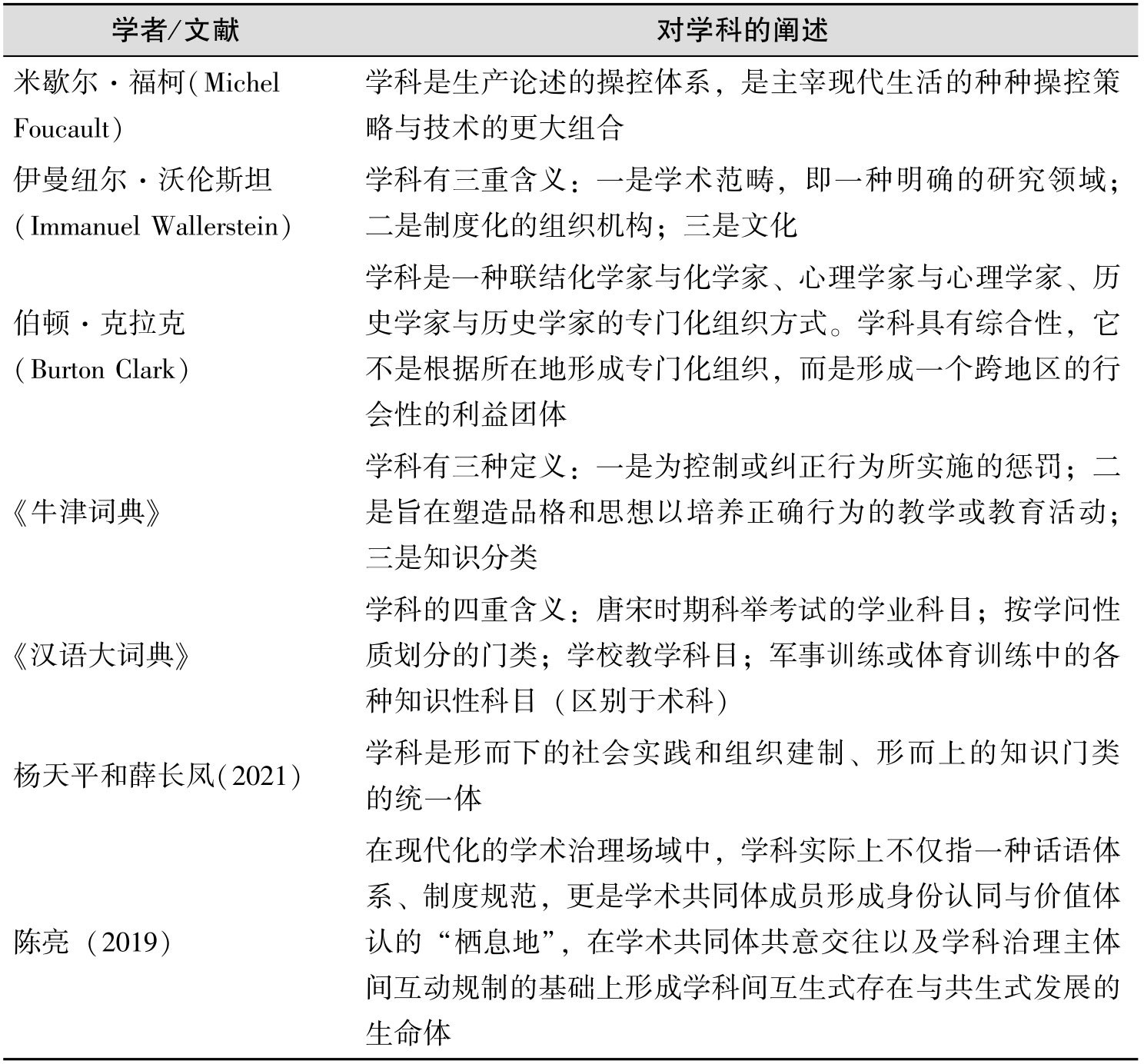 学科一词源于希腊语didasko(教)和拉丁语disco(学),具有学习的含义。古拉丁语中的disciplina,含义是对“门徒的教育”,包含知识(知识体系)和权力(孩童纪律、军纪)的双重意义。从词源看,学科最早的含义是对学生的教育、规训、训练与惩戒等,以使学生达到某一学科的行为规范的要求。不同学者及文献对学科有不同的阐述,可参考表1-3的展示。